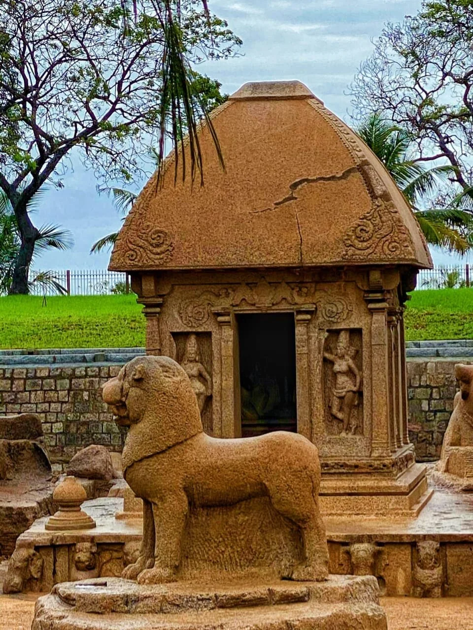 The Monlith Simha which goes on to become the Pallava Mascot alongside a Rock Cut Temple - Draupadi Ratha